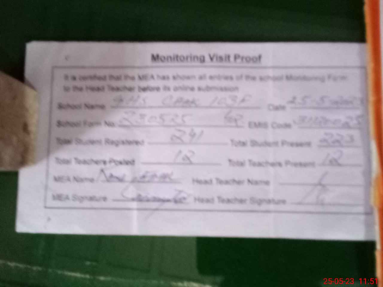 | Attendance Register | Head Teacher | MEA with School | Visit Proof |