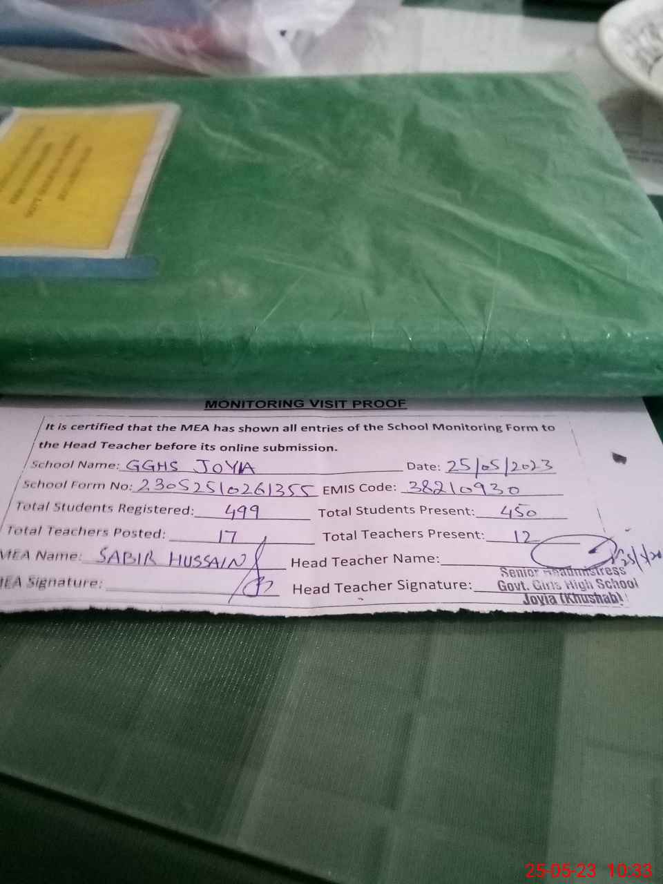 | Attendance Register | Head Teacher | MEA with School | Visit Proof |