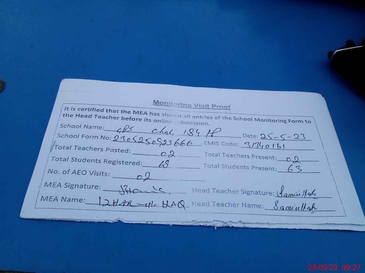 | Attendance Register | Head Teacher | MEA with School | Visit Proof |