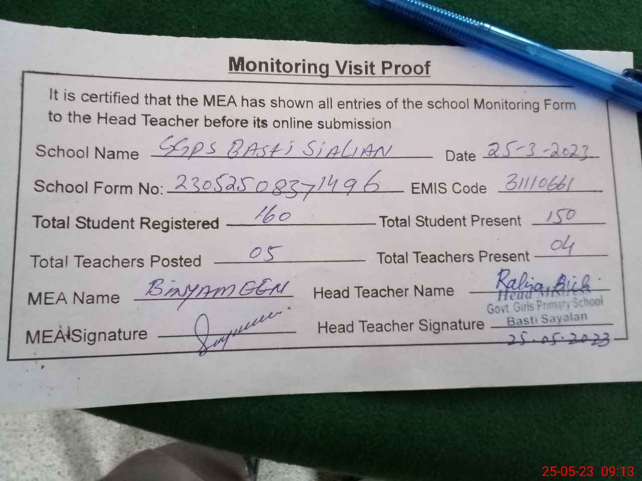 | Attendance Register | Head Teacher | MEA with School | Visit Proof |