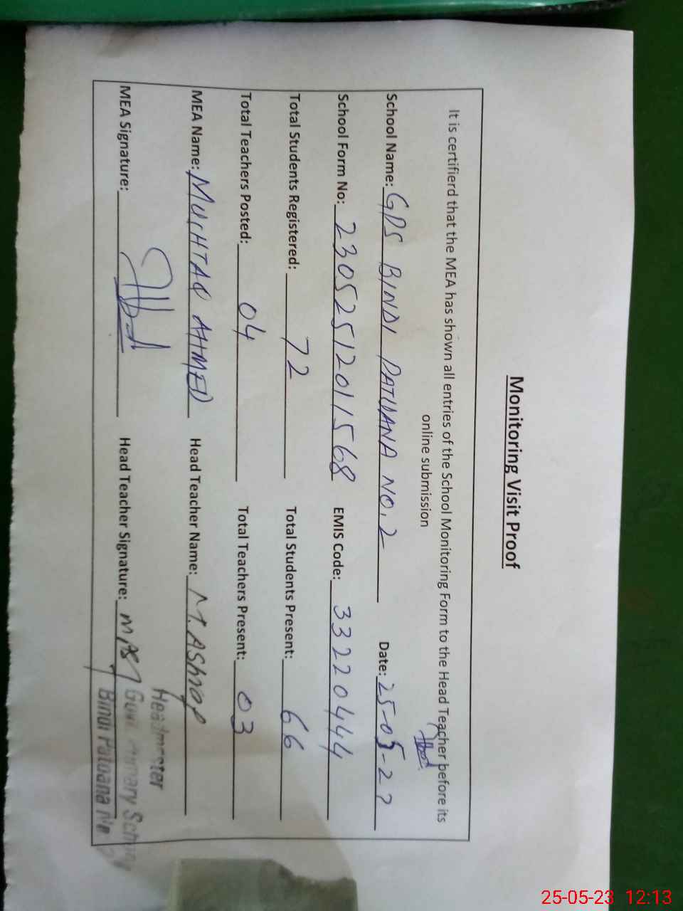 | Attendance Register | Head Teacher | MEA with School | Visit Proof |