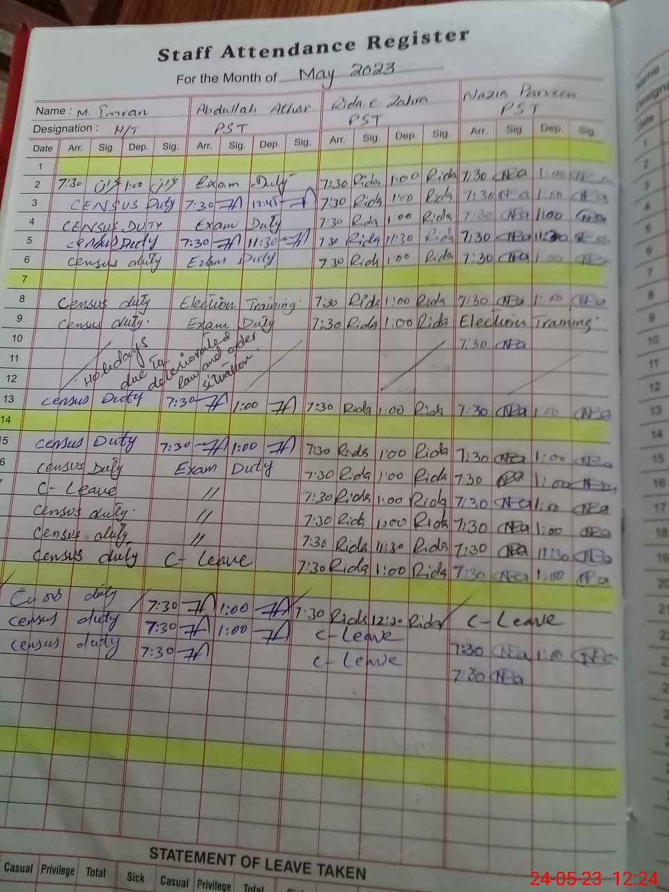 | Leave | Duty | Absent | Maternity | Medical | Ex- Pak |