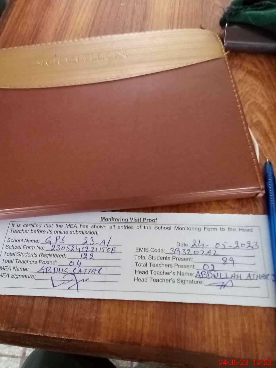 | Attendance Register | Head Teacher | MEA with School | Visit Proof |