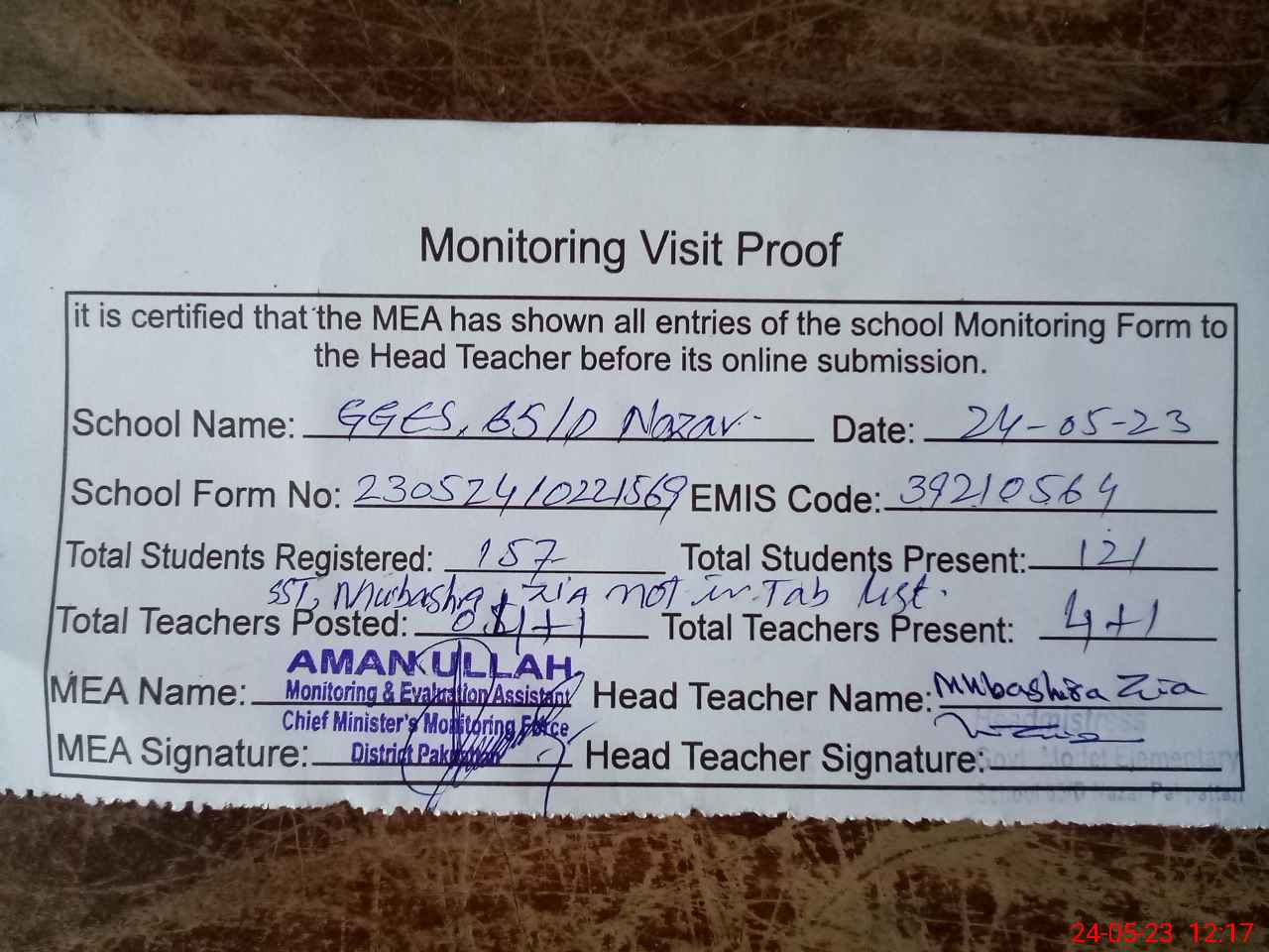 | Attendance Register | Head Teacher | MEA with School | Visit Proof |