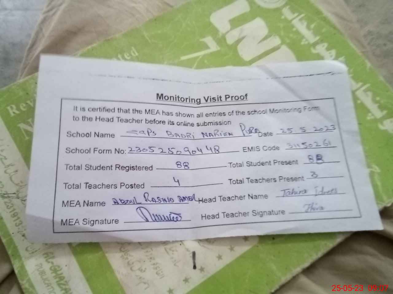 | Attendance Register | Head Teacher | MEA with School | Visit Proof |