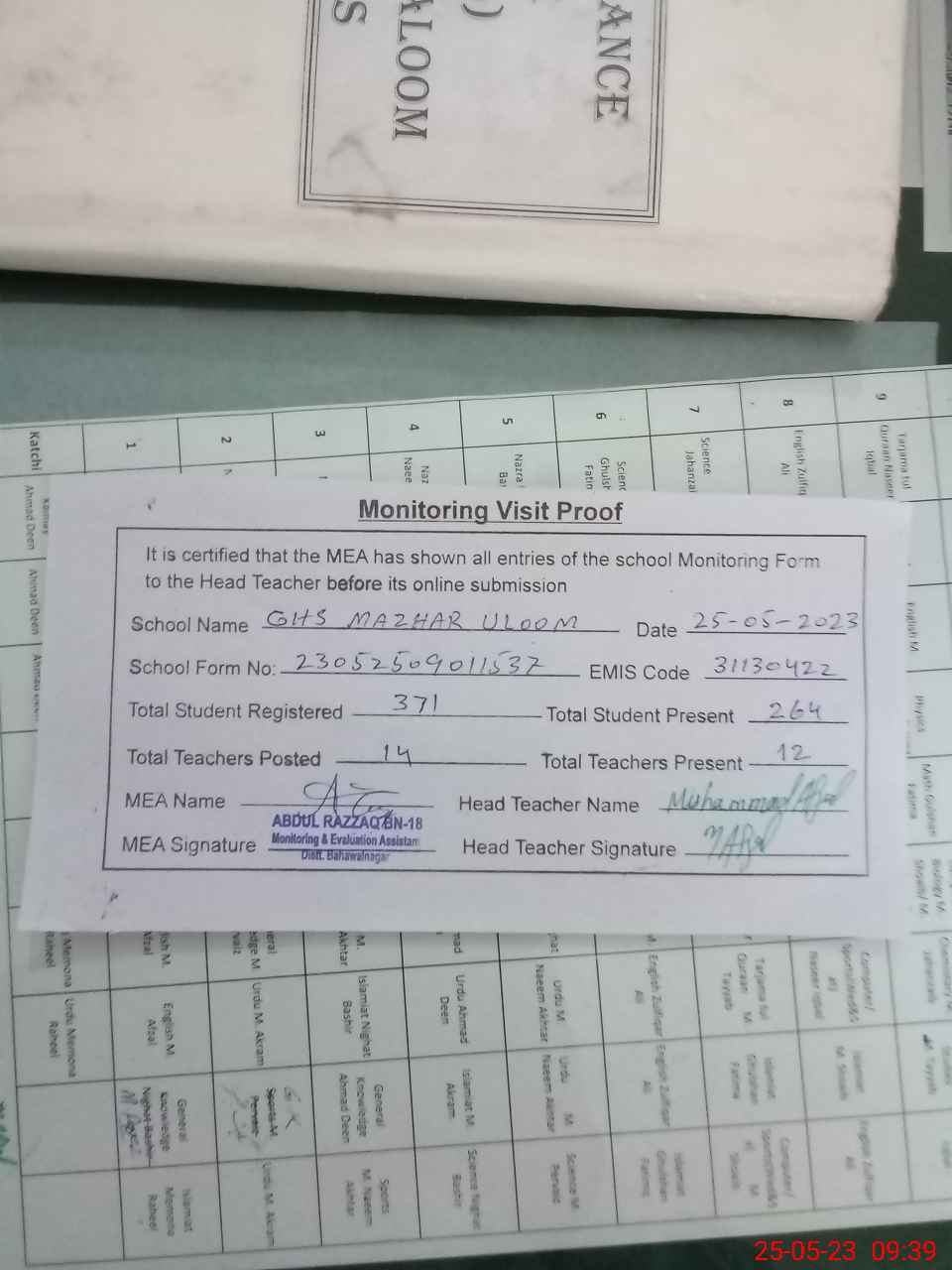 | Attendance Register | Head Teacher | MEA with School | Visit Proof |