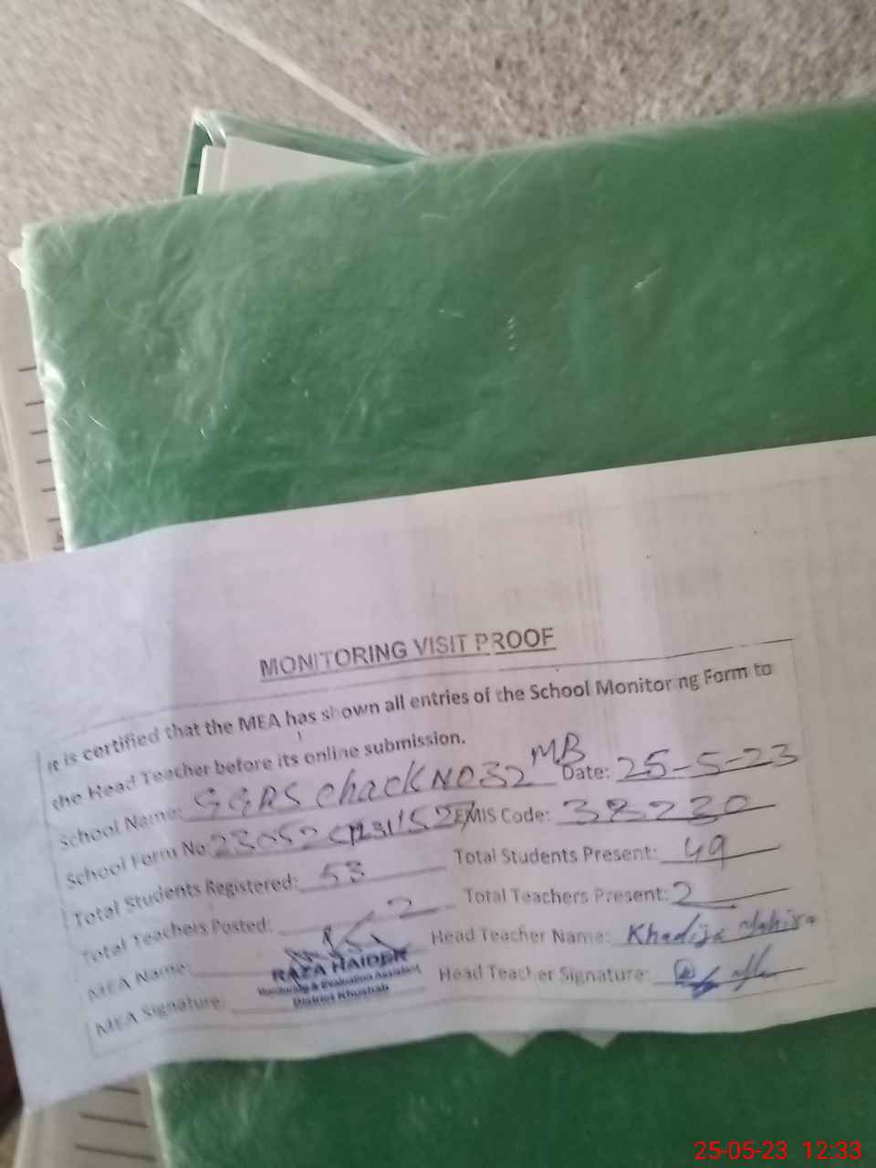 | Attendance Register | Head Teacher | MEA with School | Visit Proof |