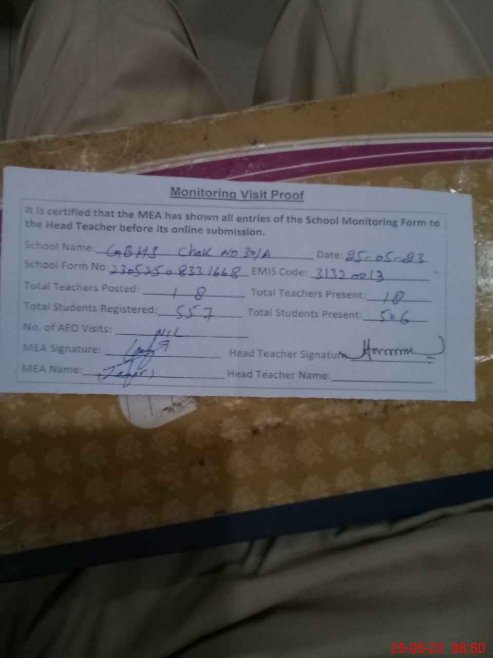 | EMIS Code: 31320013 | Name of School: GHS CHAK NO.30/A | |||