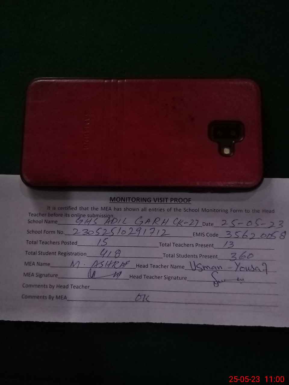 | Attendance Register | Head Teacher | MEA with School | Visit Proof |