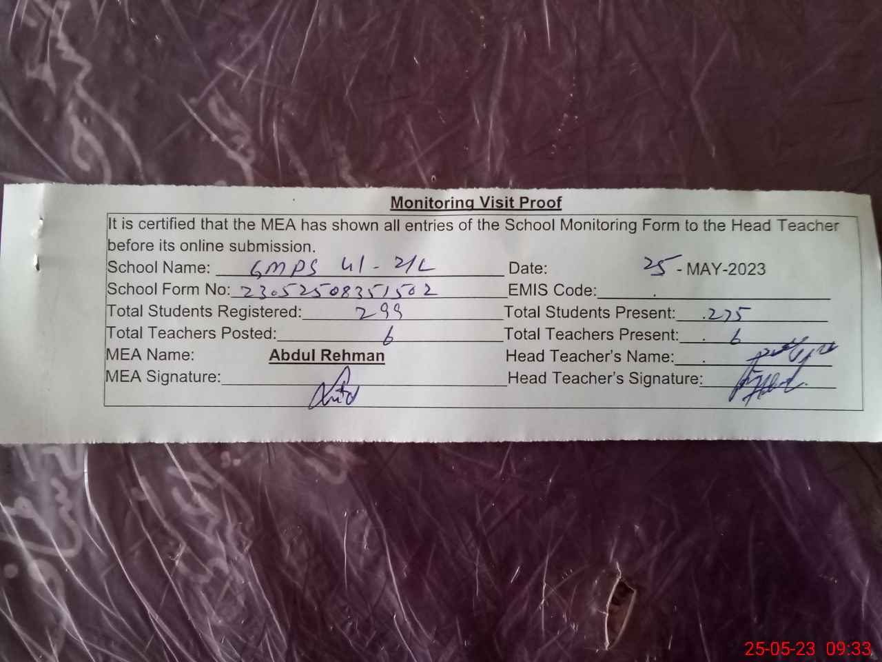 | Attendance Register | Head Teacher | MEA with School | Visit Proof |