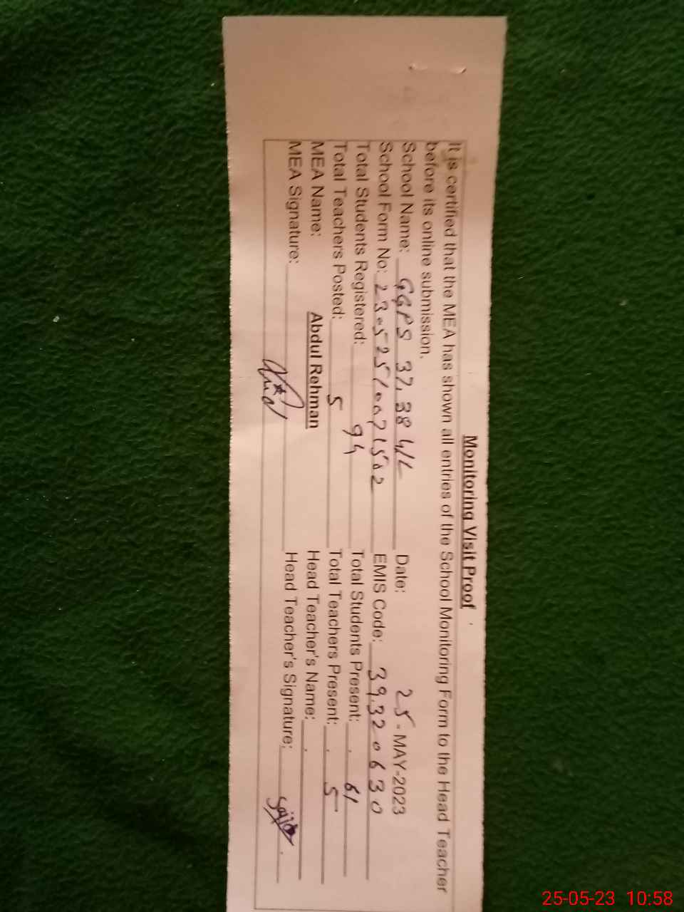 | Attendance Register | Head Teacher | MEA with School | Visit Proof |