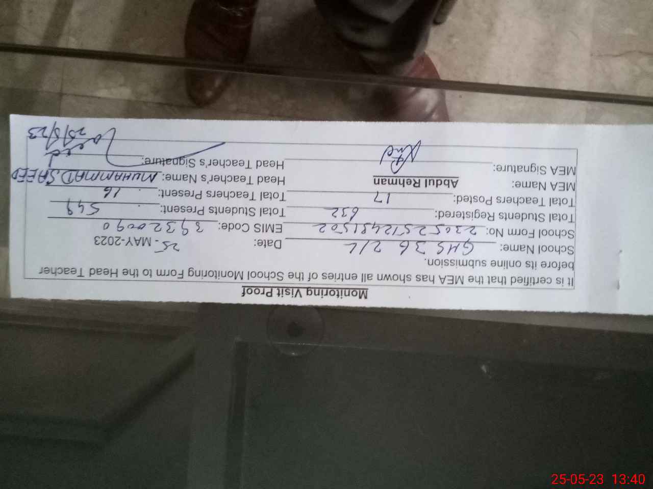 | Attendance Register | Head Teacher | MEA with School | Visit Proof |