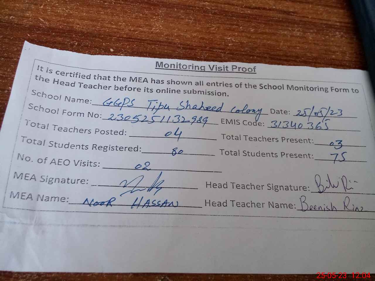 | Attendance Register | Head Teacher | MEA with School | Visit Proof |