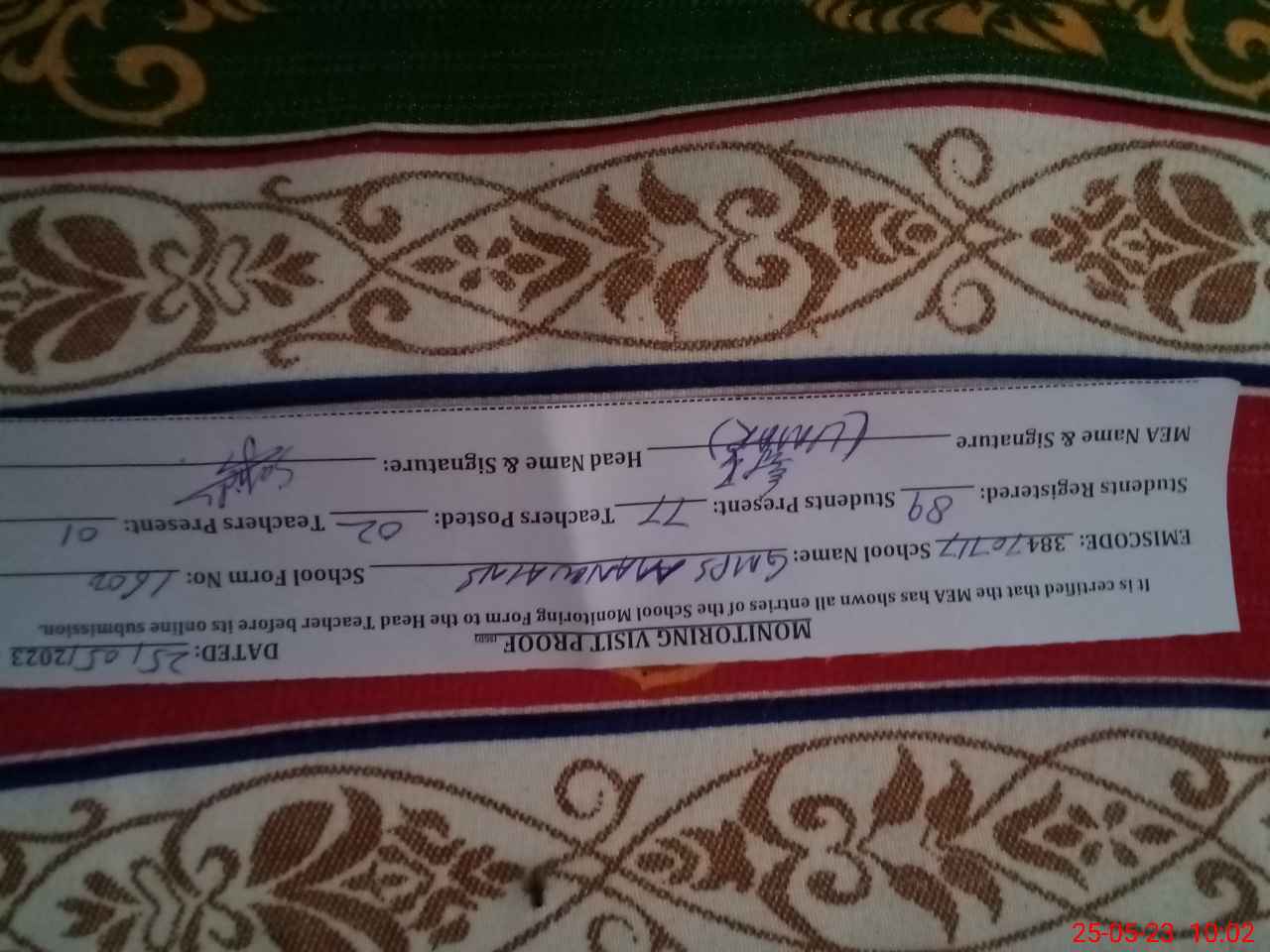 | Certified that this School was Inspected by the Undersigned MEA/DMO Today and the Information Stated Above is as Per Record. | |||||