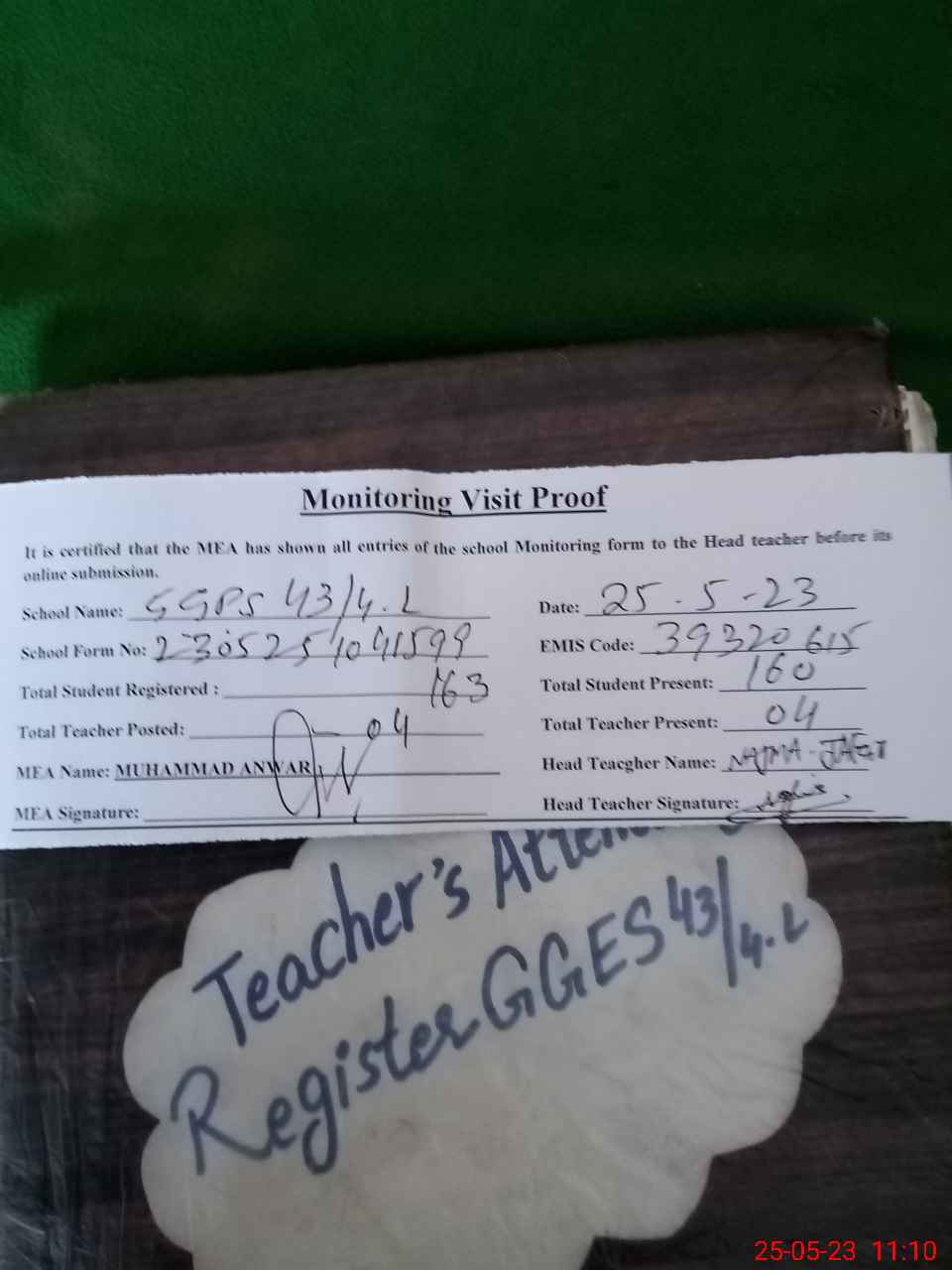 | Attendance Register | Head Teacher | MEA with School | Visit Proof |