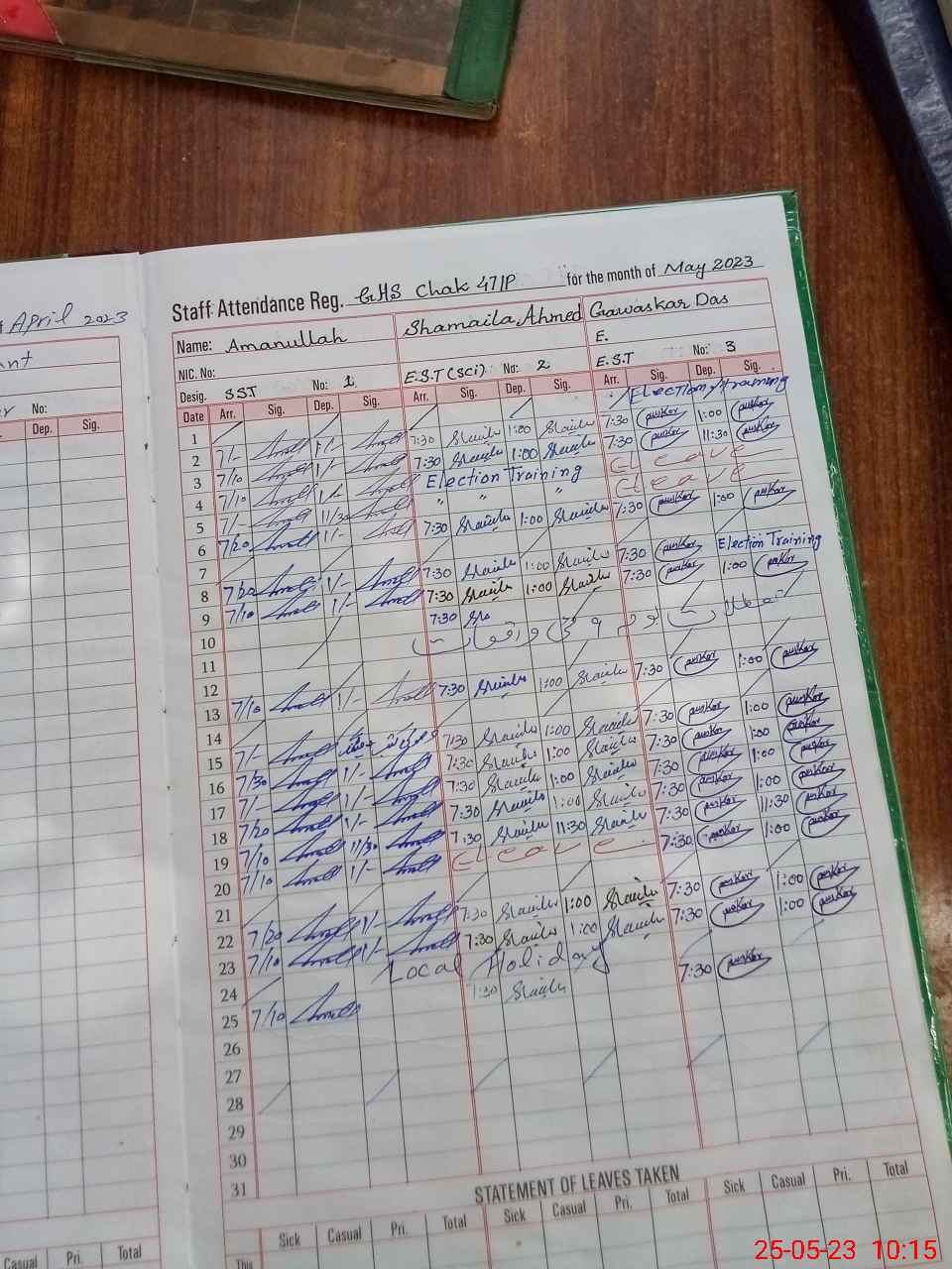 Leave Type | Remarks for today (Leave,Training, Exam,Absent,Late, Other duty) |