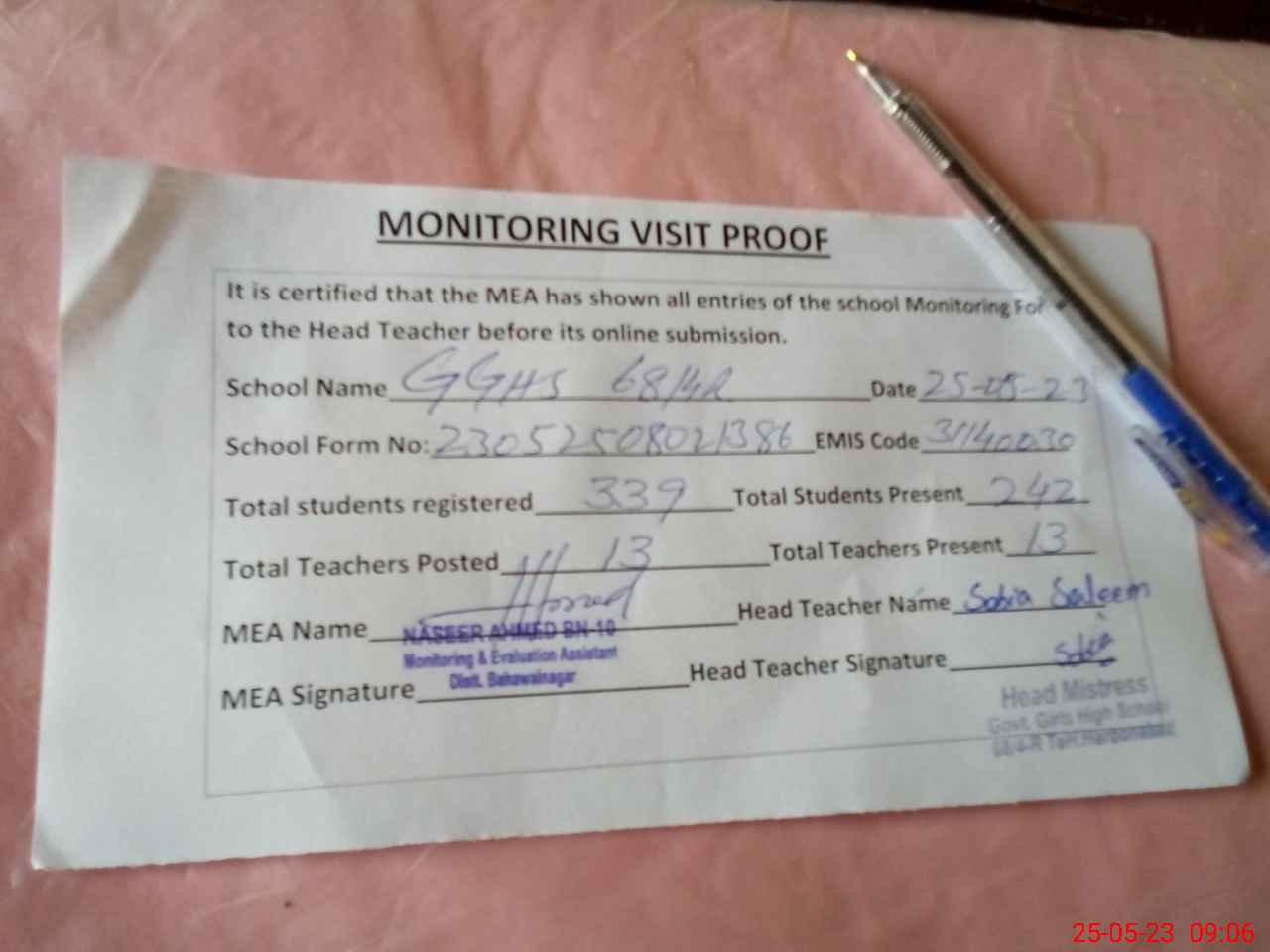 | EMIS Code: 31140030 | Name of School: GGHS CHAK NO 68/4-R | |||