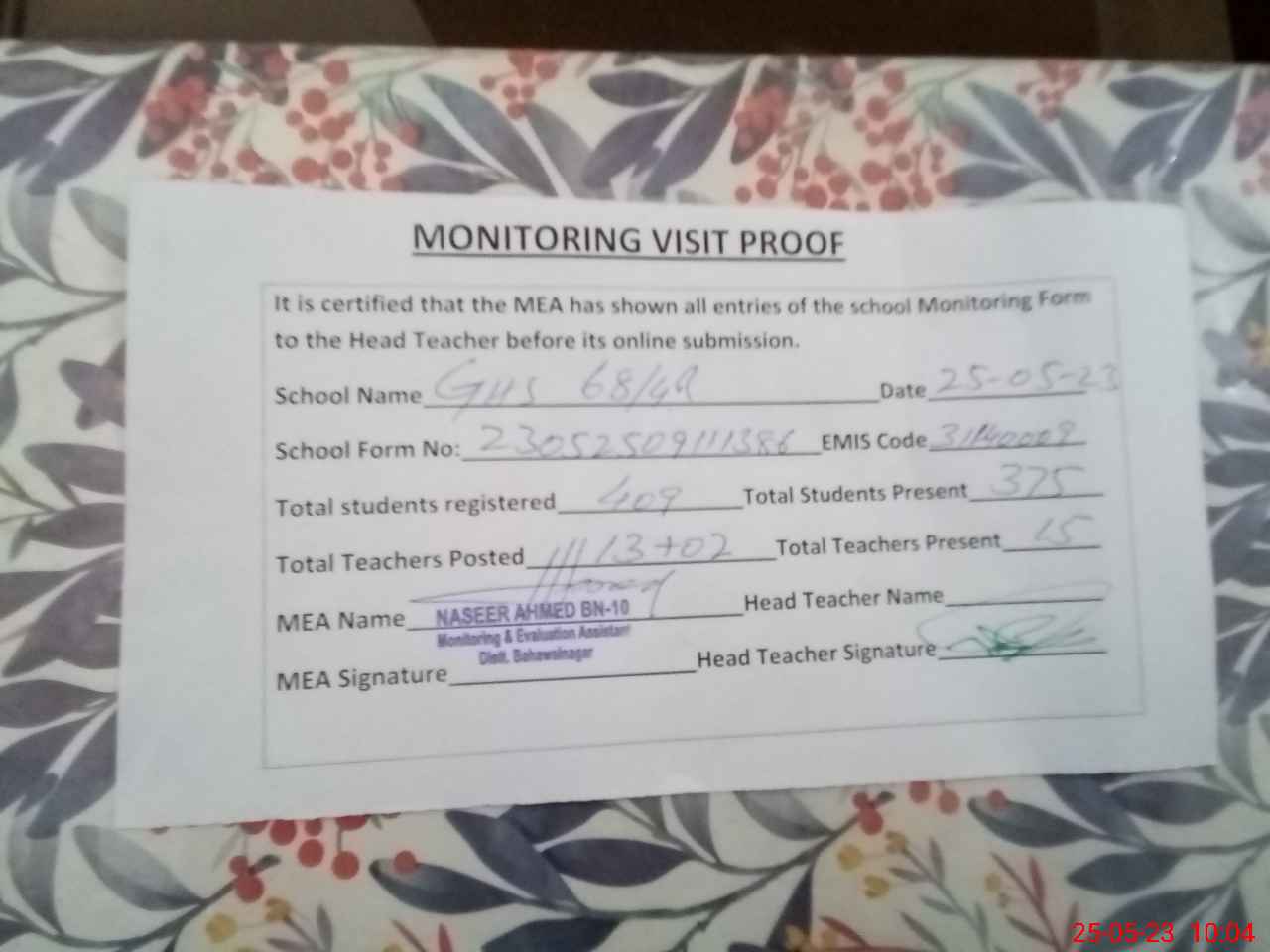 | EMIS Code: 31140009 | Name of School: GHS CHAK 68/4-R | |||