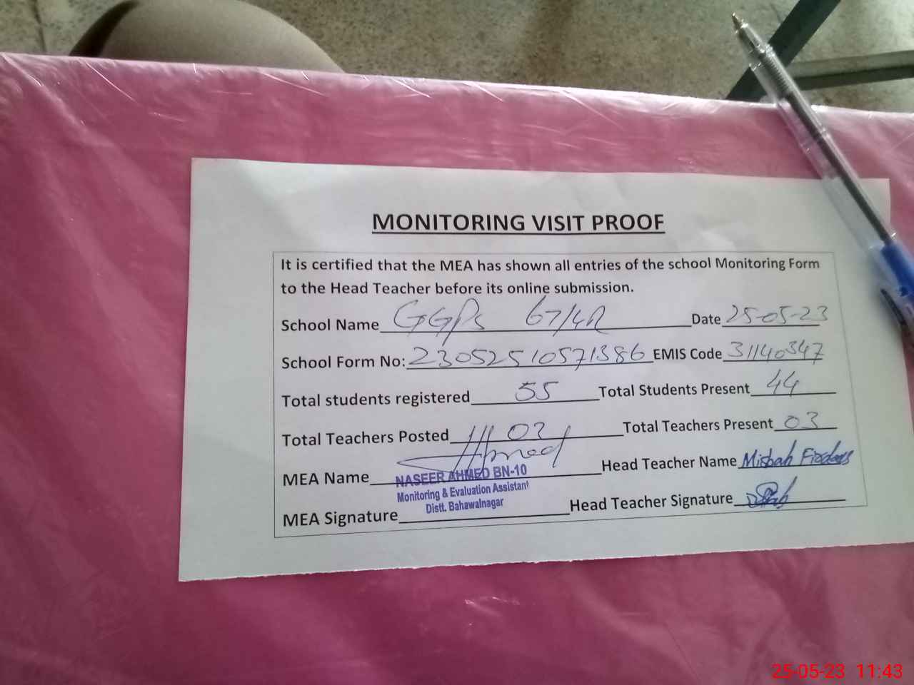 | Attendance Register | Head Teacher | MEA with School | Visit Proof |