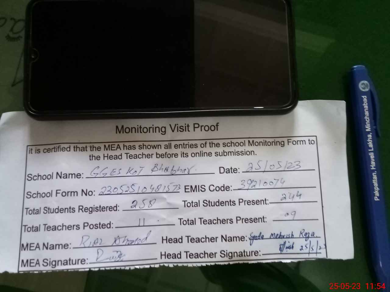 | Attendance Register | Head Teacher | MEA with School | Visit Proof |