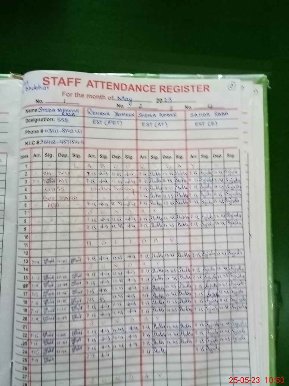 | CNIC | Full Name | Designation | R/C | Absence During Last Calender Month |