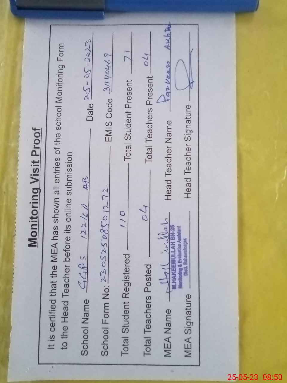 | Monitoring Date: 25-05-2023 | Start Time: 25-05-2023 08:20 AM | End Time: 25-05-2023 08:54 AM | Name of MEA: Mu**** ha**** ul**** BN25 | |