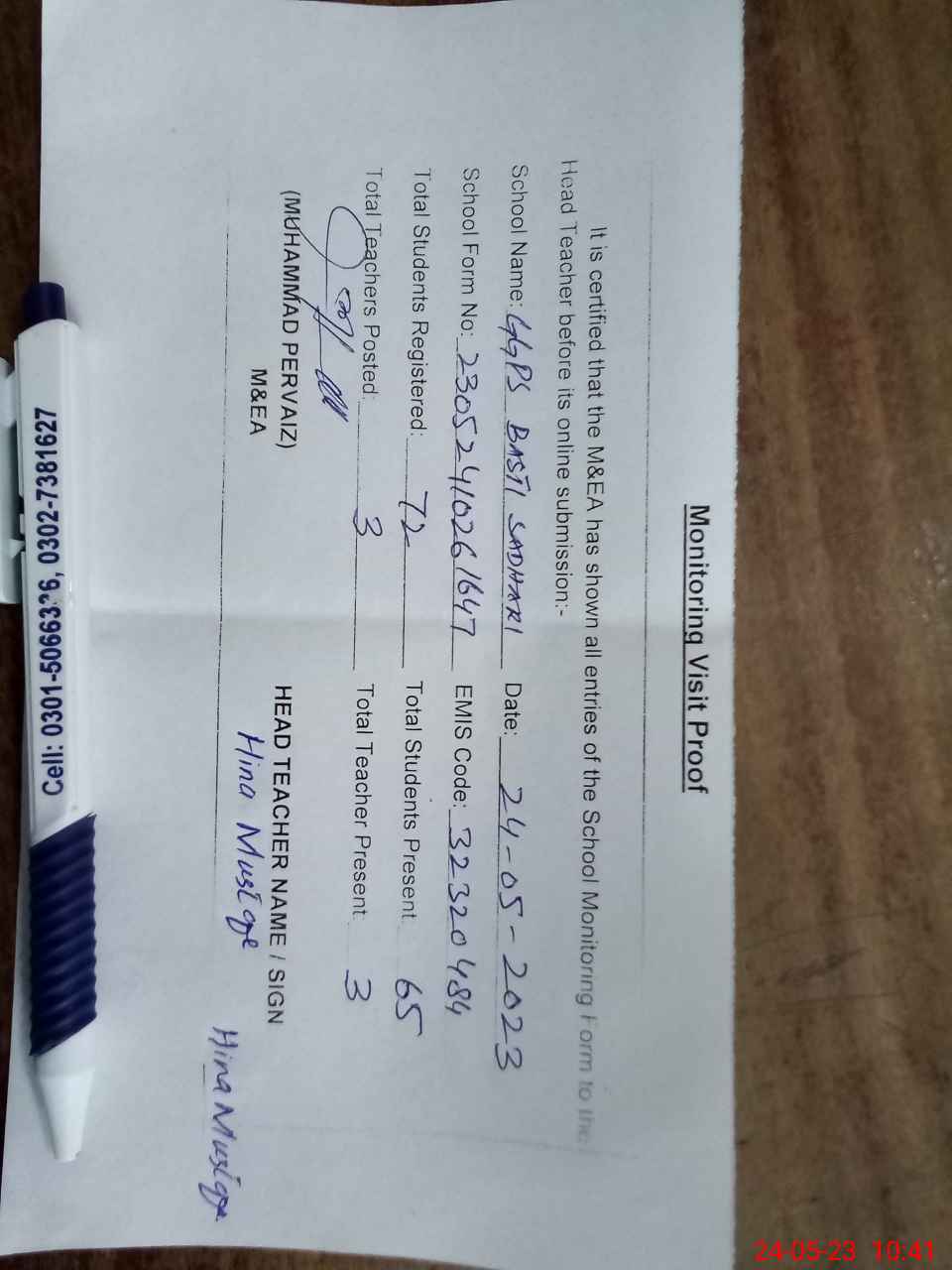 | Name: Sa**** Na**** Designation: (School Headmaster's/Headmistress's) ESE Phone/Cell Number: 03**** |
