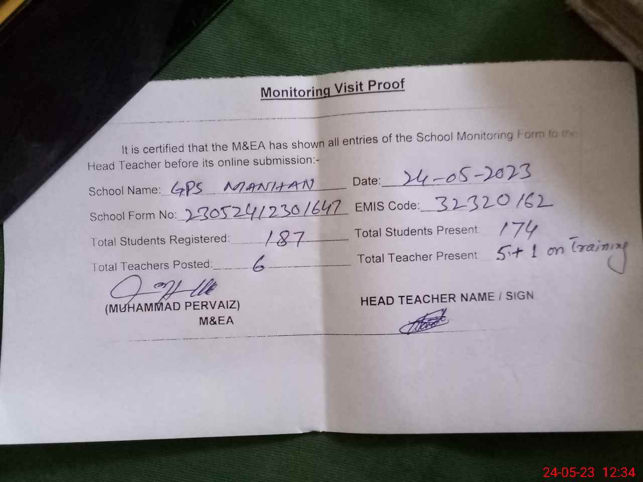 | Attendance Register | Head Teacher | MEA with School | Visit Proof |