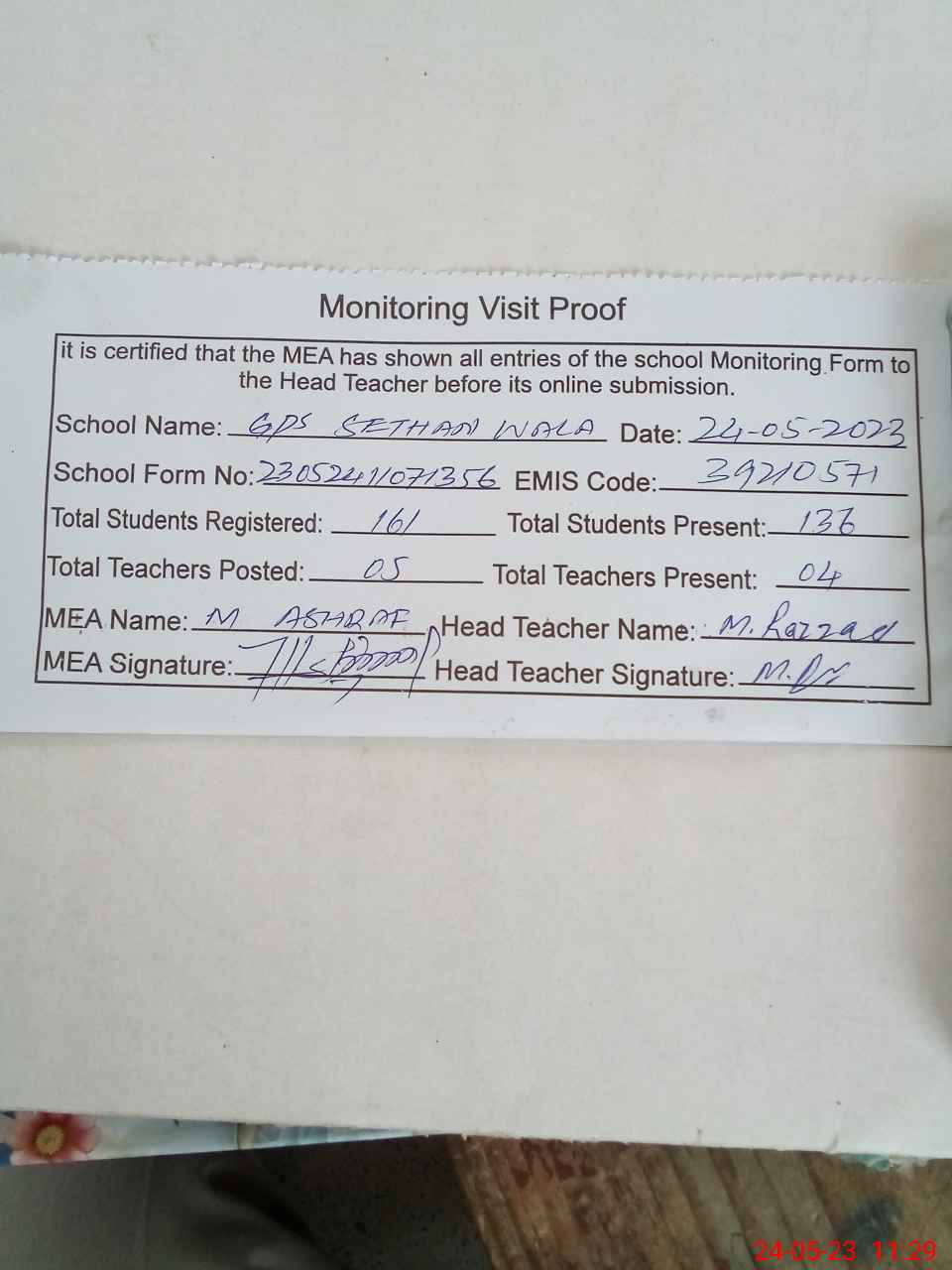 | Attendance Register | Head Teacher | MEA with School | Visit Proof |