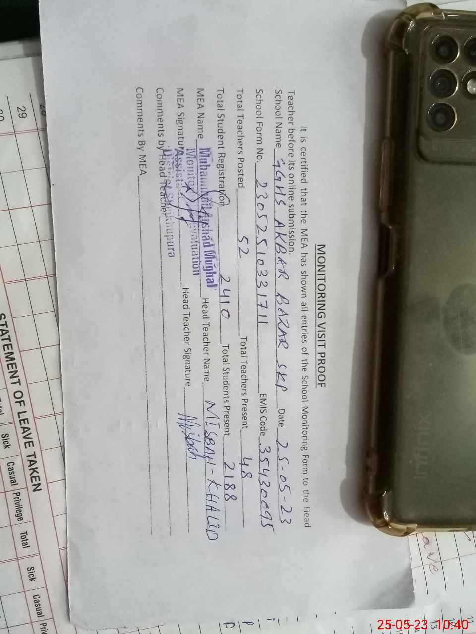 | Attendance Register | Head Teacher | MEA with School | Visit Proof |