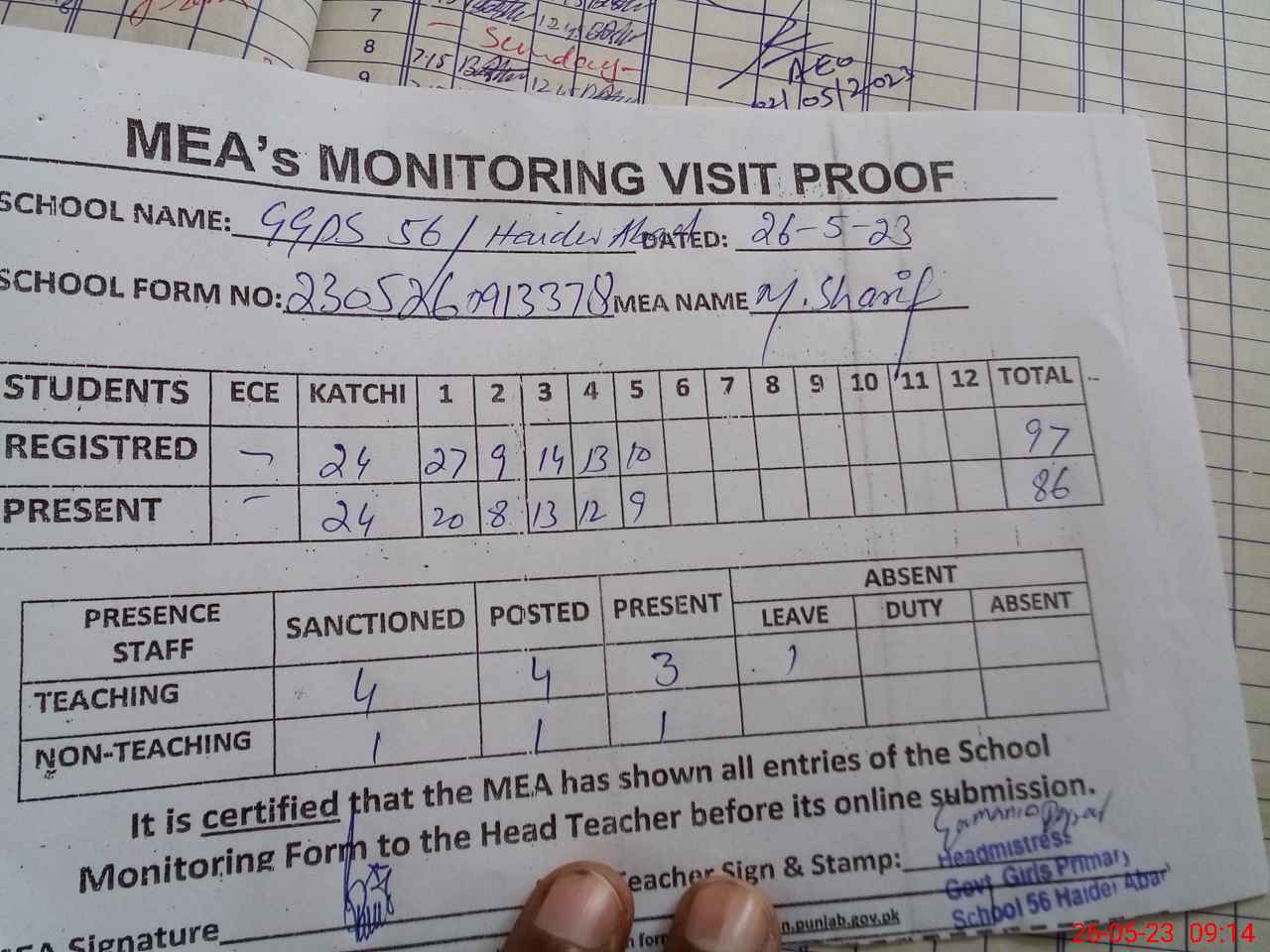 | Attendance Register | Head Teacher | MEA with School | Visit Proof |