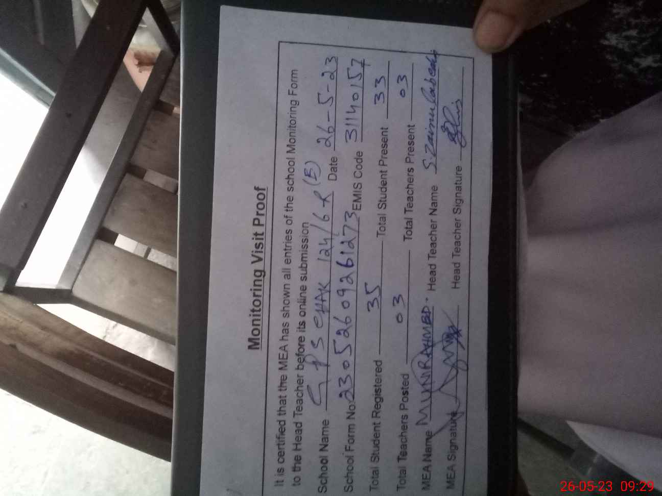 | Attendance Register | Head Teacher | MEA with School | Visit Proof |