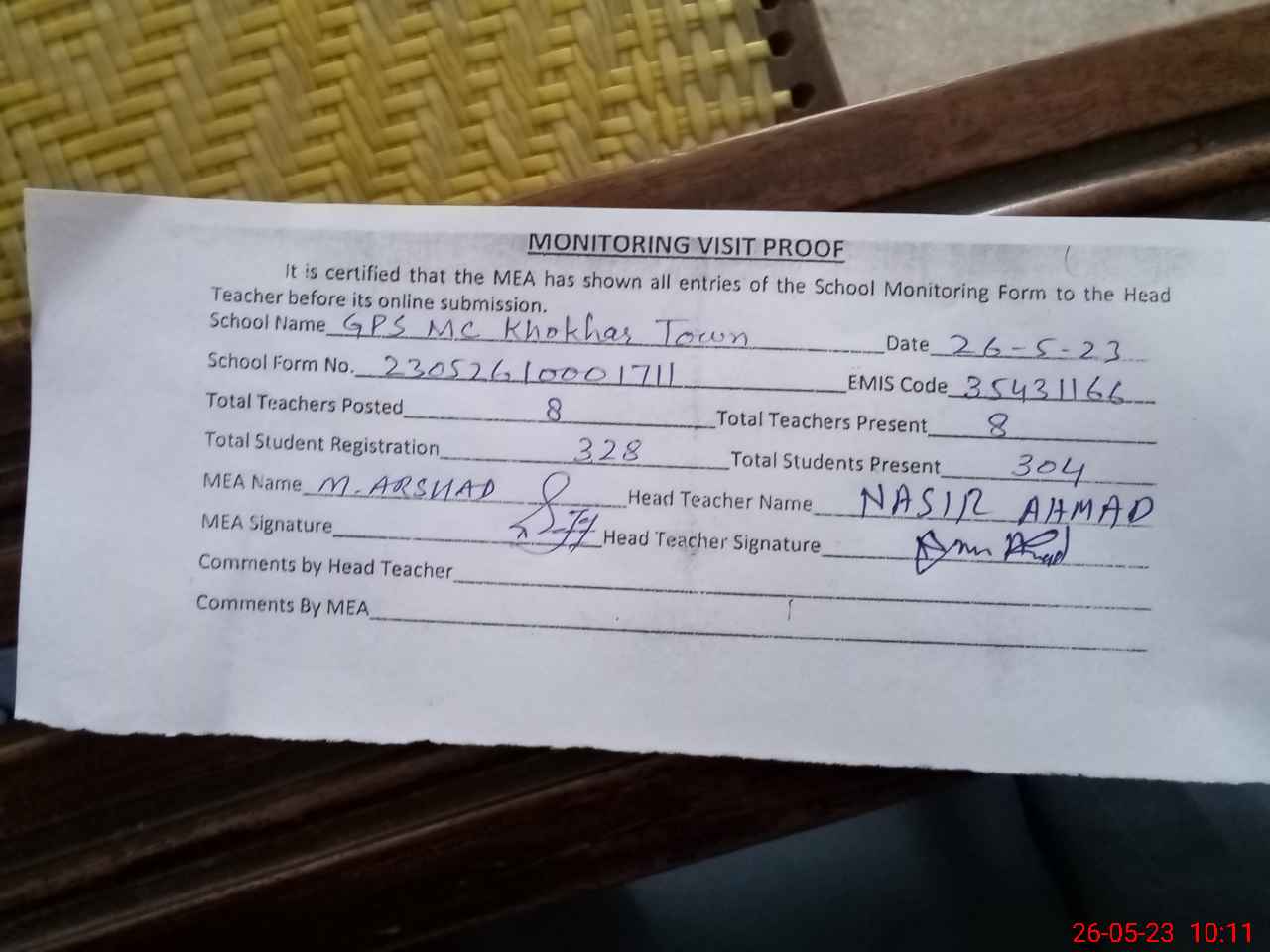 | Attendance Register | Head Teacher | MEA with School | Visit Proof |