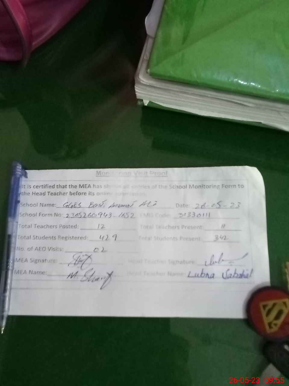 | Attendance Register | Head Teacher | MEA with School | Visit Proof |