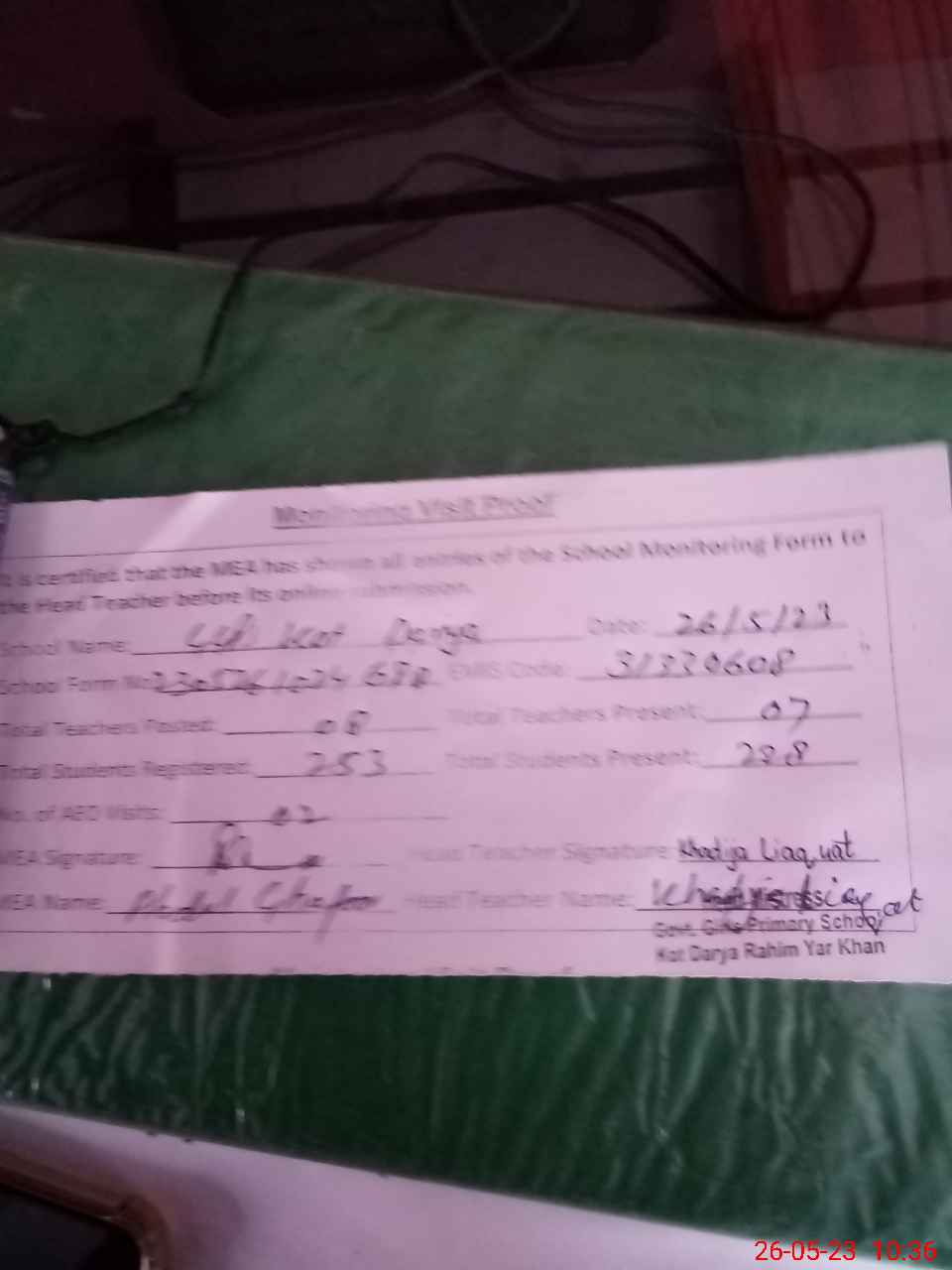| Attendance Register | Head Teacher | MEA with School | Visit Proof |