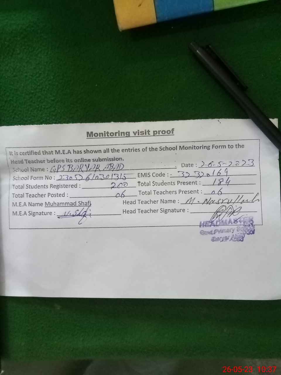 | Attendance Register | Head Teacher | MEA with School | Visit Proof |
