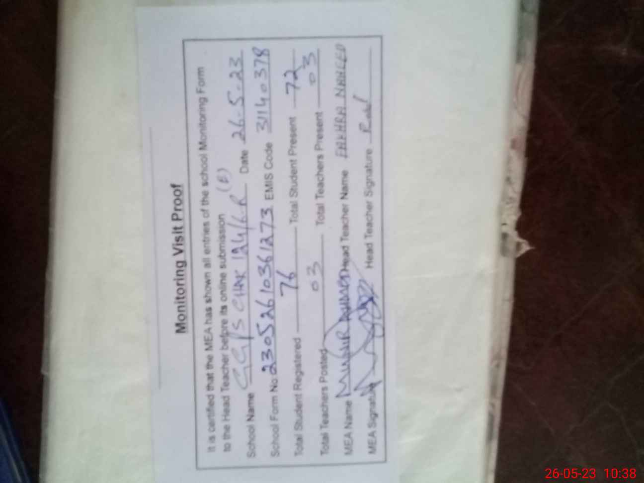 | Attendance Register | Head Teacher | MEA with School | Visit Proof |