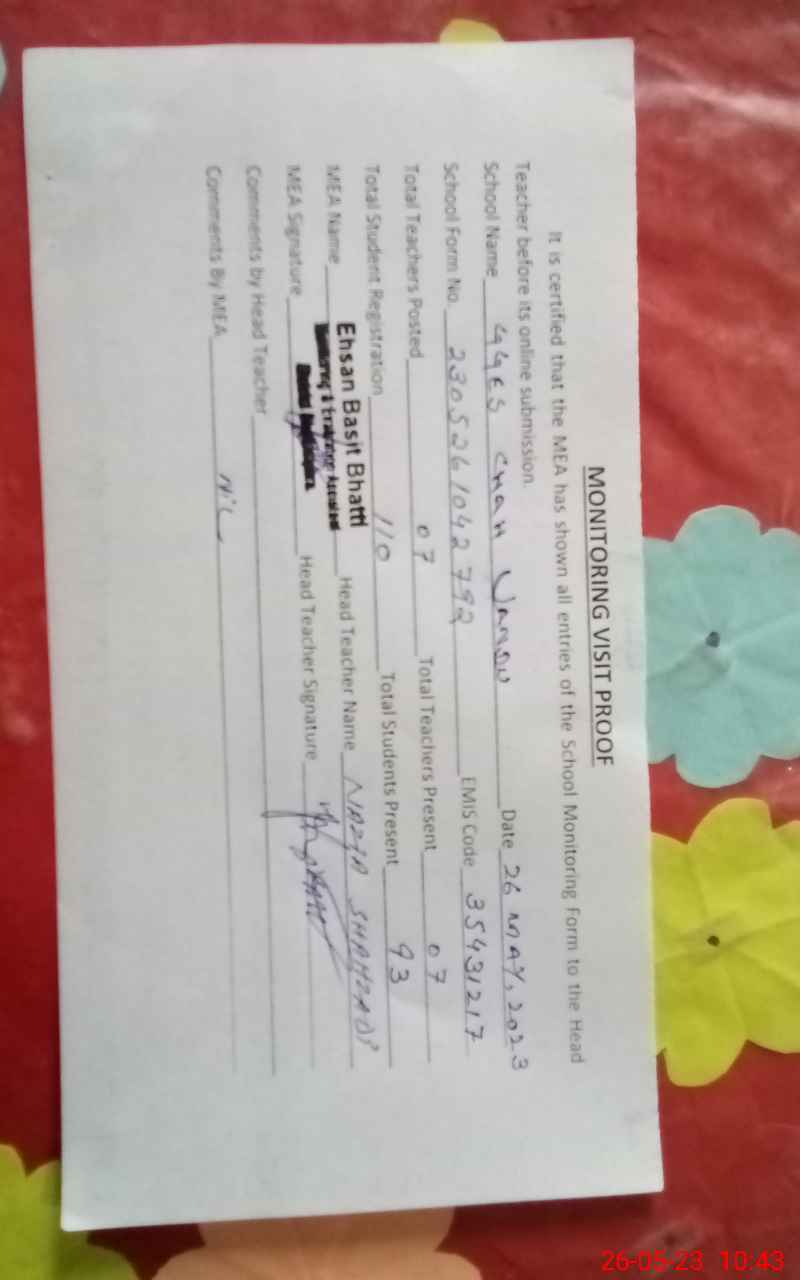 | Certified that this School was Inspected by the Undersigned MEA/DMO Today and the Information Stated Above is as Per Record. | |||||