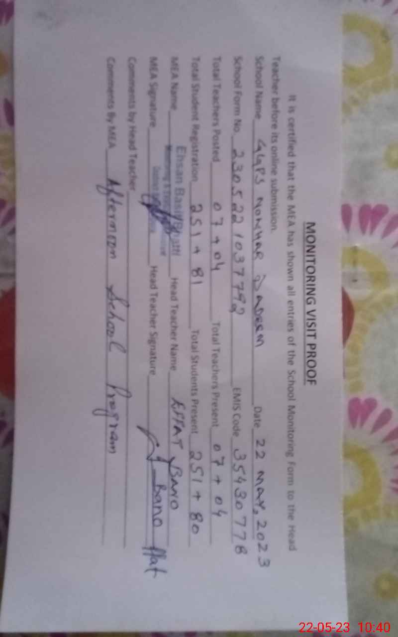 | Certified that this School was Inspected by the Undersigned MEA/DMO Today and the Information Stated Above is as Per Record. | |||||