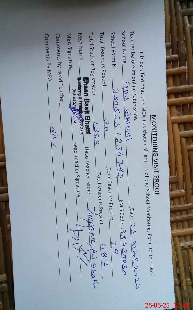 | Certified that this School was Inspected by the Undersigned MEA/DMO Today and the Information Stated Above is as Per Record. | |||||