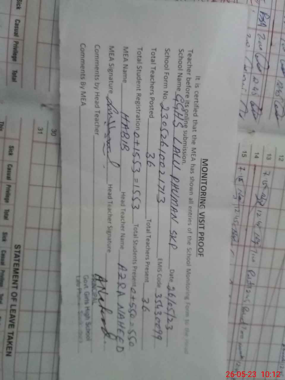 | Attendance Register | Head Teacher | MEA with School | Visit Proof |