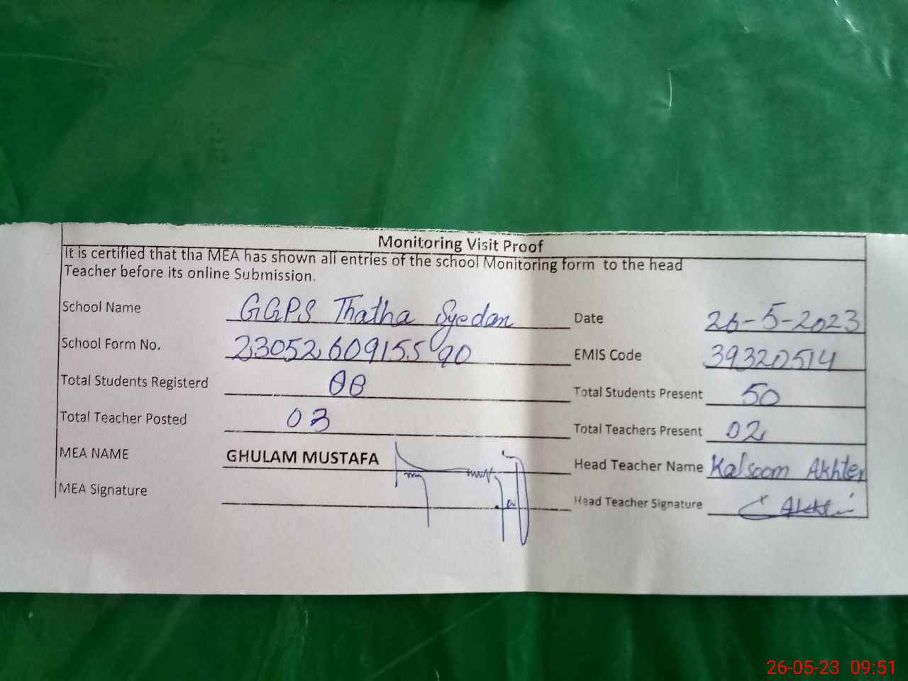 | Attendance Register | Head Teacher | MEA with School | Visit Proof |
