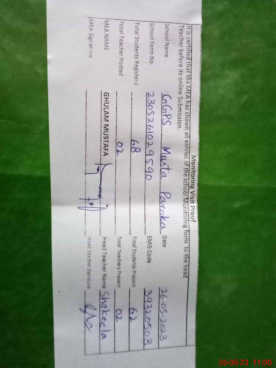 | Total no. of Classrooms: 2 No. of Classrooms Used for Teaching: 2 No. of Classrooms Storing Old Furniture, FTBs, etc: 0Comments if Any: It is certified that as per head teacher statement last NSB fund an amount of rupees 43449 credited in the month of March 2023 |