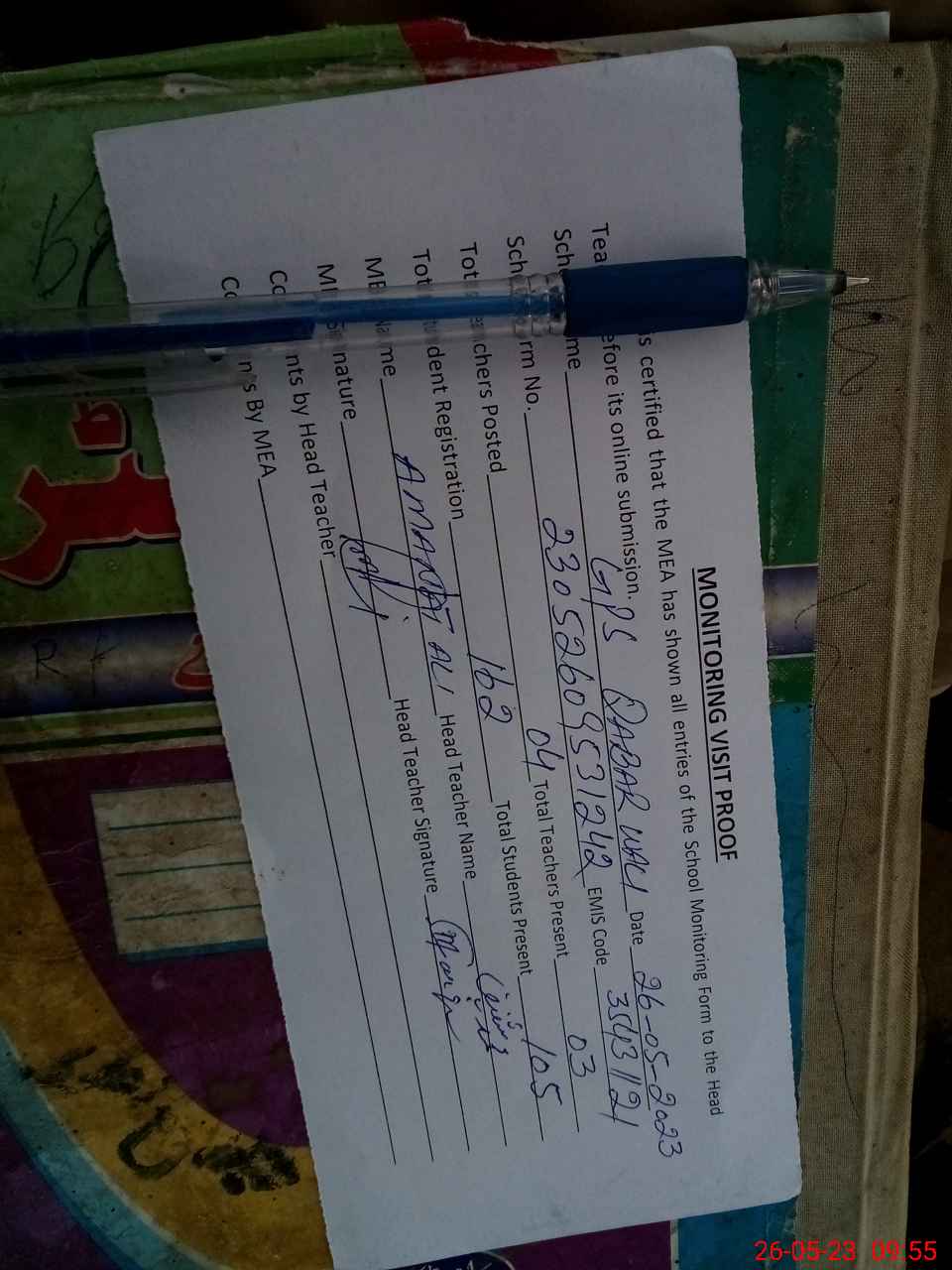 | Attendance Register | Head Teacher | MEA with School | Visit Proof |