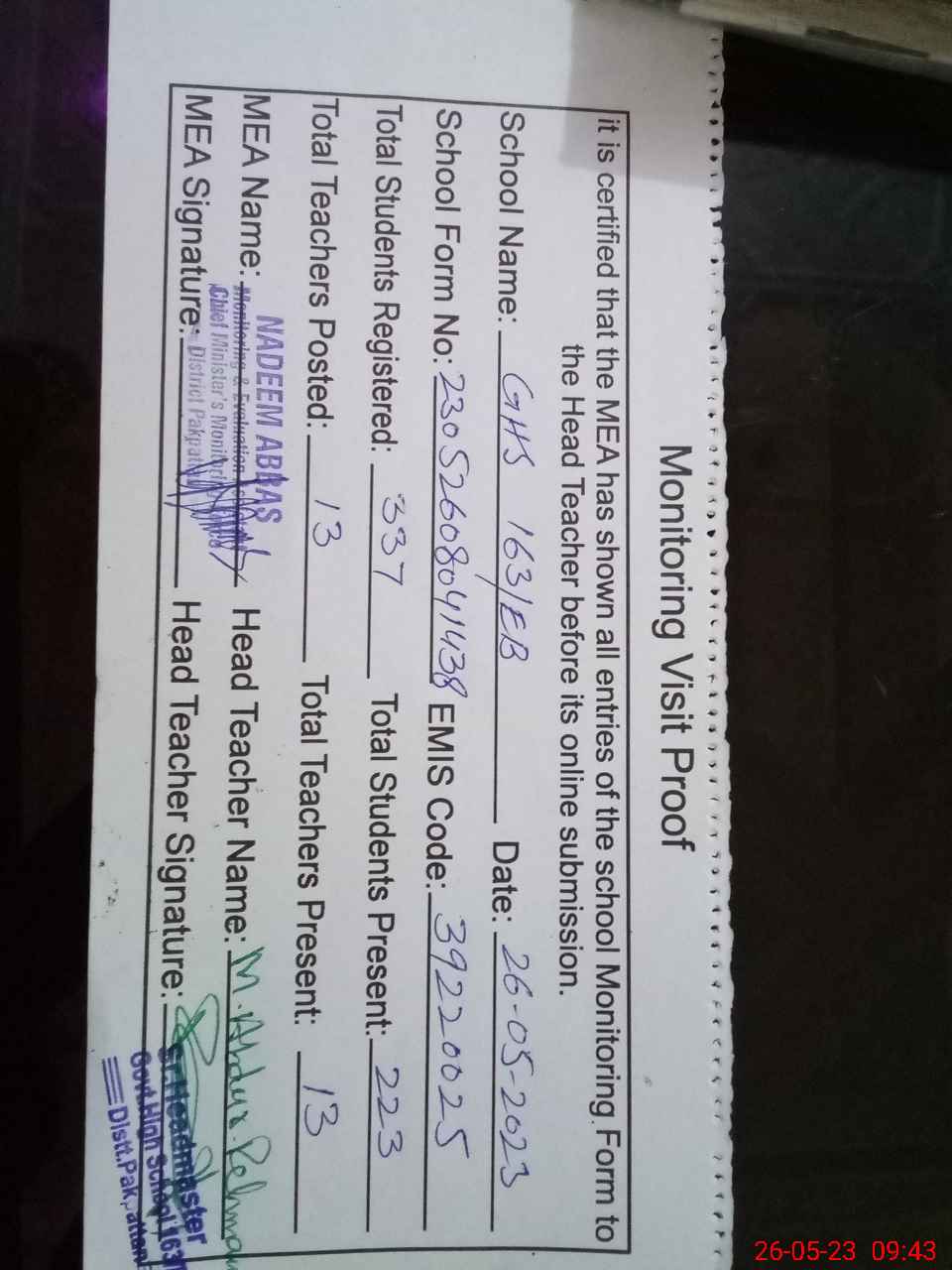 | Attendance Register | Head Teacher | MEA with School | Visit Proof |