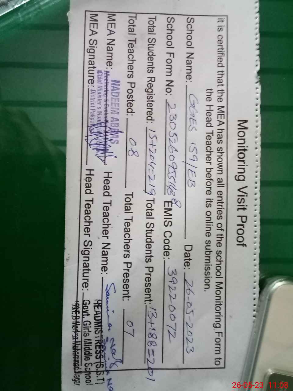 | Attendance Register | Head Teacher | MEA with School | Visit Proof |