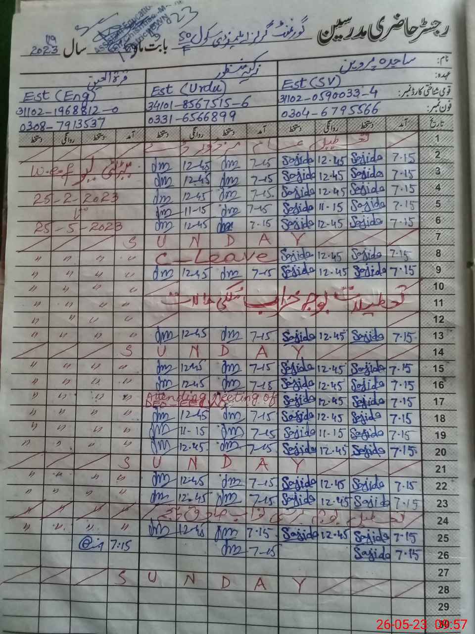 | Name: Fa**** Ir**** Designation: (School Headmaster's/Headmistress's) SST Sc Phone/Cell Number: 03**** |