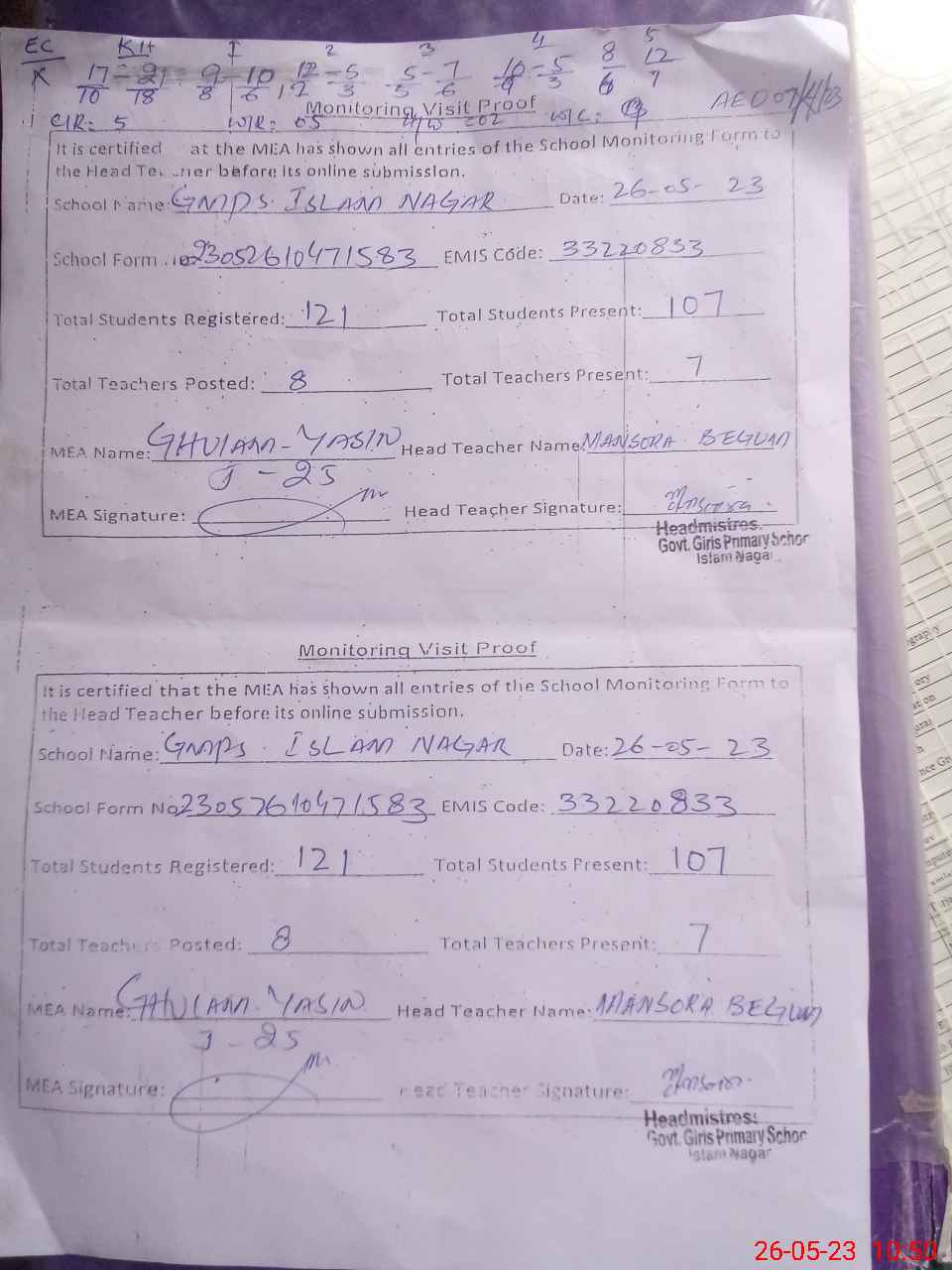 | Attendance Register | Head Teacher | MEA with School | Visit Proof |