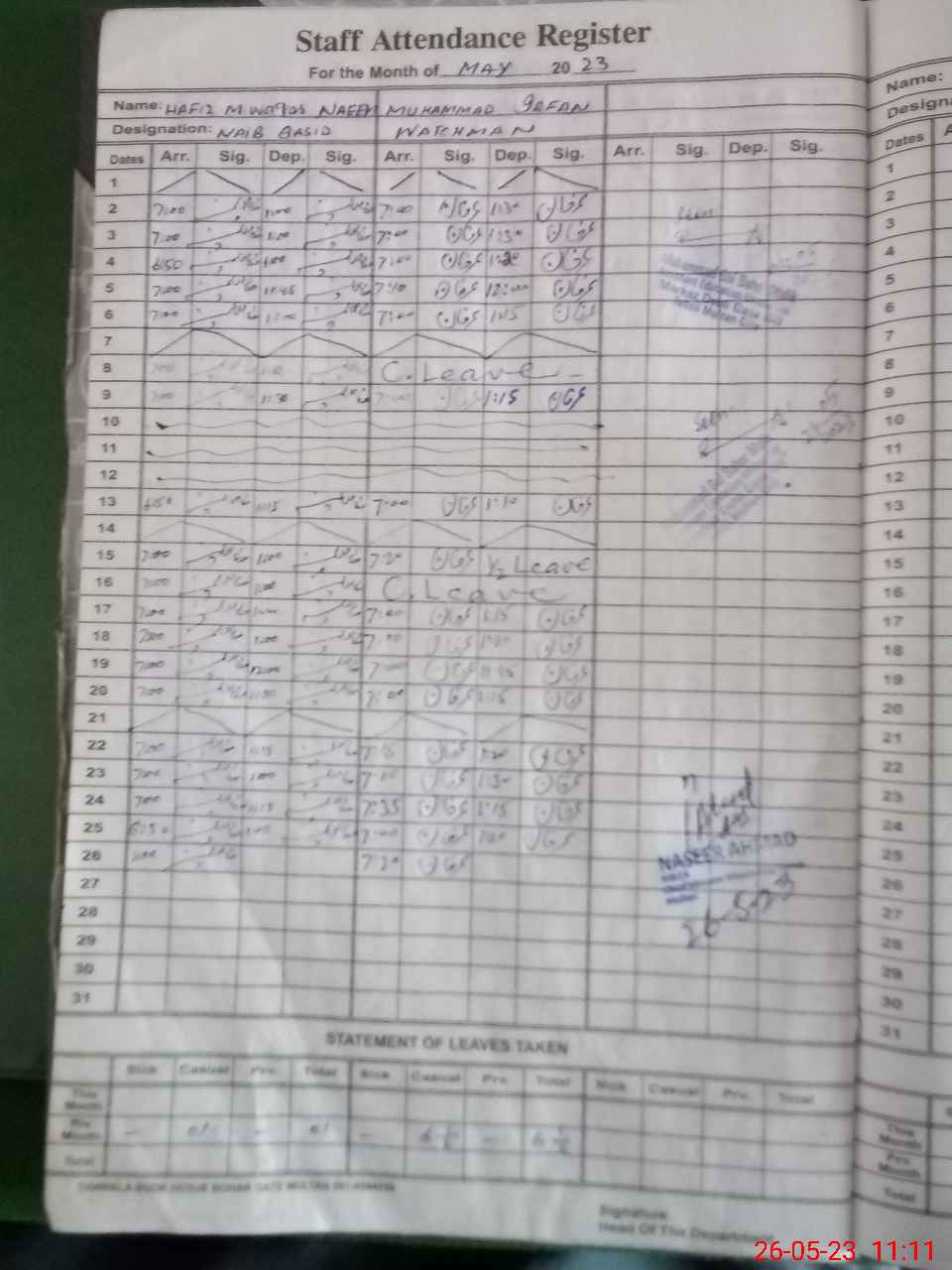 | CNIC | Full Name | Designation | R/C | Absence During Last Calender Month |
