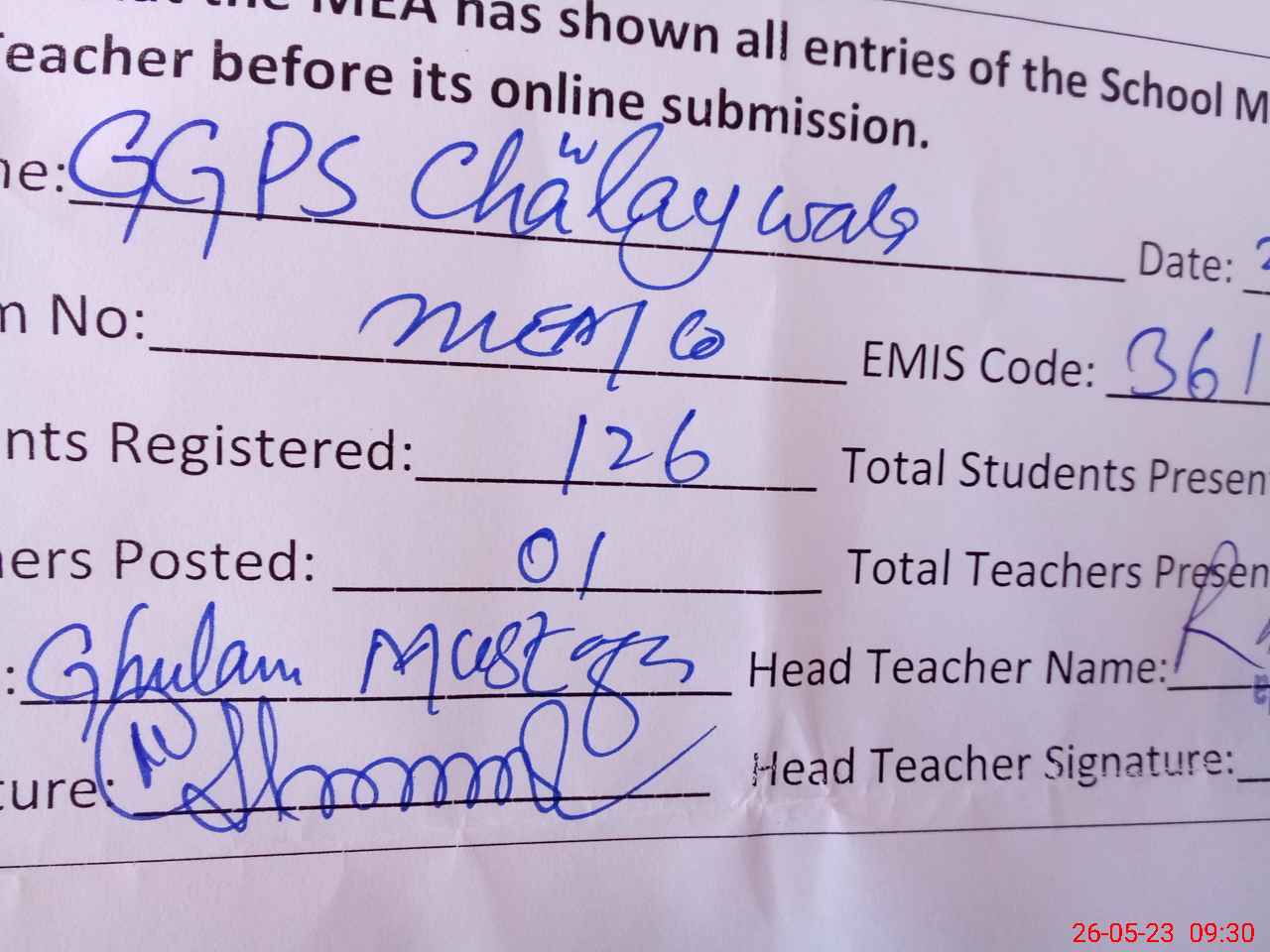 | Attendance Register | Head Teacher | MEA with School | Visit Proof |